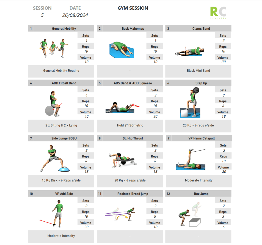 Our programs are tailored to the player’s conditions and go from Intensive Rehab plans, to GYM or Home-based interventions, or Hybrid programmes combining on-site sessions, with video-assisted and/or guided autonomous sessions according to the individual context.